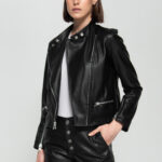 Crisp with an edge. Super-soft faux leather biker with a round neck and stand-up collar with press-stud fastening. Straight-cut silhouette. Classic metal hardware. Offset zip closure at front. Zippered pockets and welt pockets at interior. Fully lined.