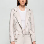 Super-soft light beige faux-suede biker. Straight-cut silhouette. Classic metal hardware. Press-stud fastening at notched lapel collar. Offset zip closure at front. Zippered pockets and adjustable belt with pin-buckle fastening at waist. Welt pockets at interior. Fully lined.